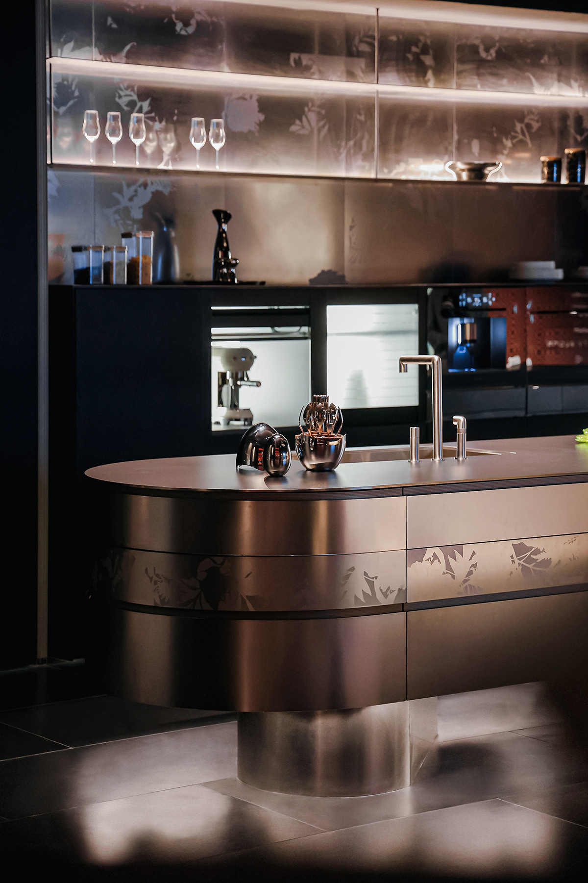 若说「四季妆成」是温柔的情感絮语,那么「月光岛台」便是力量与优雅的极致交响。这款重达 2 吨、价值 200 万的金属单品,以 304 实芯不锈钢为材质,长近 6 米、高约 1.1 米的体量,却在柔美的弧形倒角设计中消解了厚重感,宛如一轮满月悬于空间,尽显贵气与温润。作为功能与美学的完美融合,「月光岛台」不仅具备西厨操作区、储物空间、隐形电器收纳等全功能配置,更重新定义了奢侈品家居的价值标准:真正的奢侈,是用创造打破边界,让工艺、设计与情感完美融合。